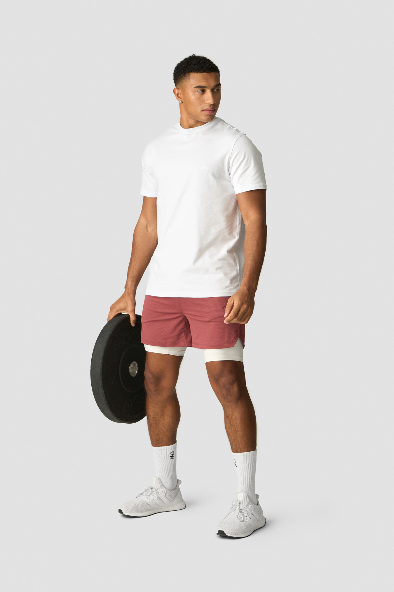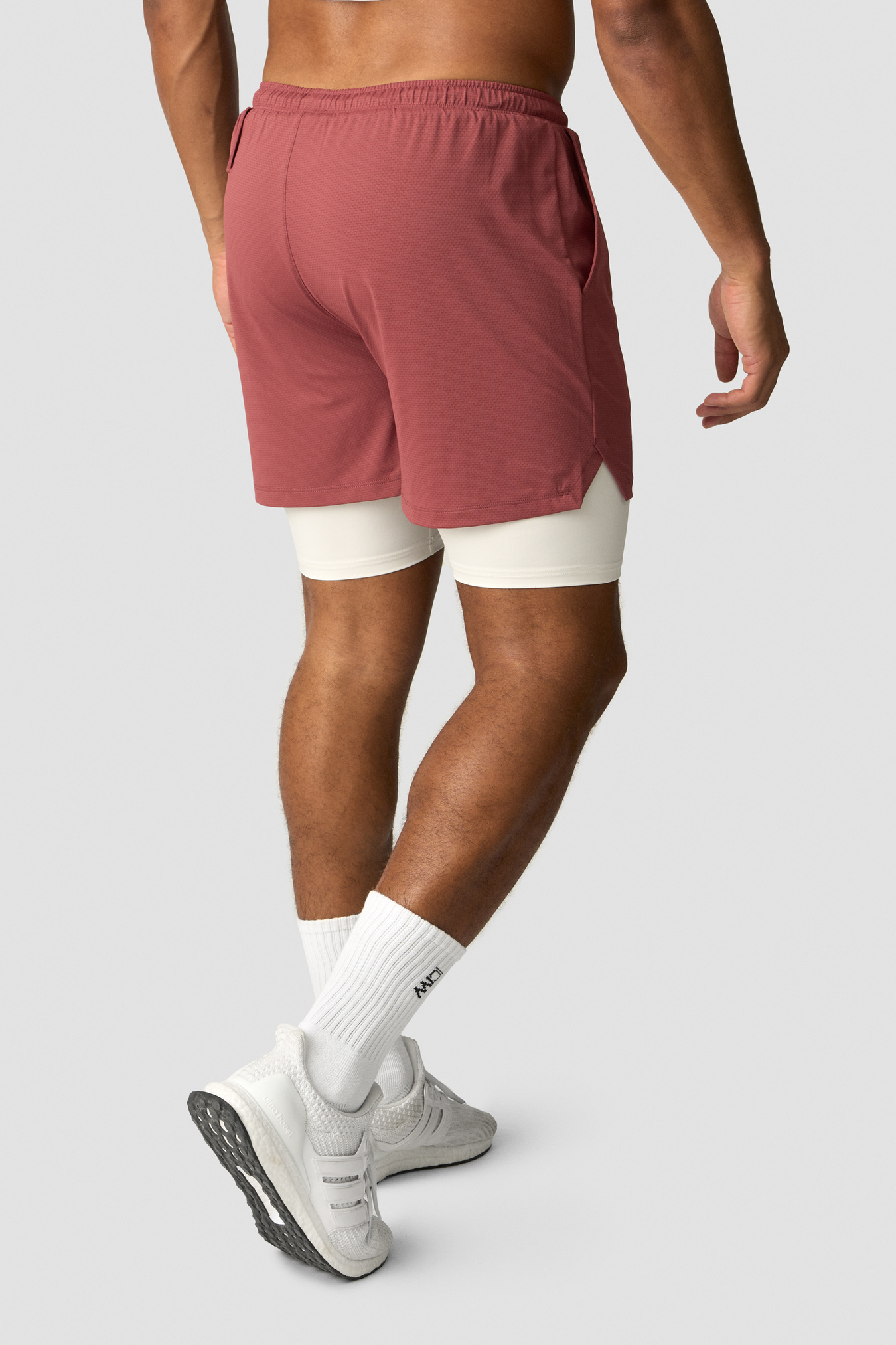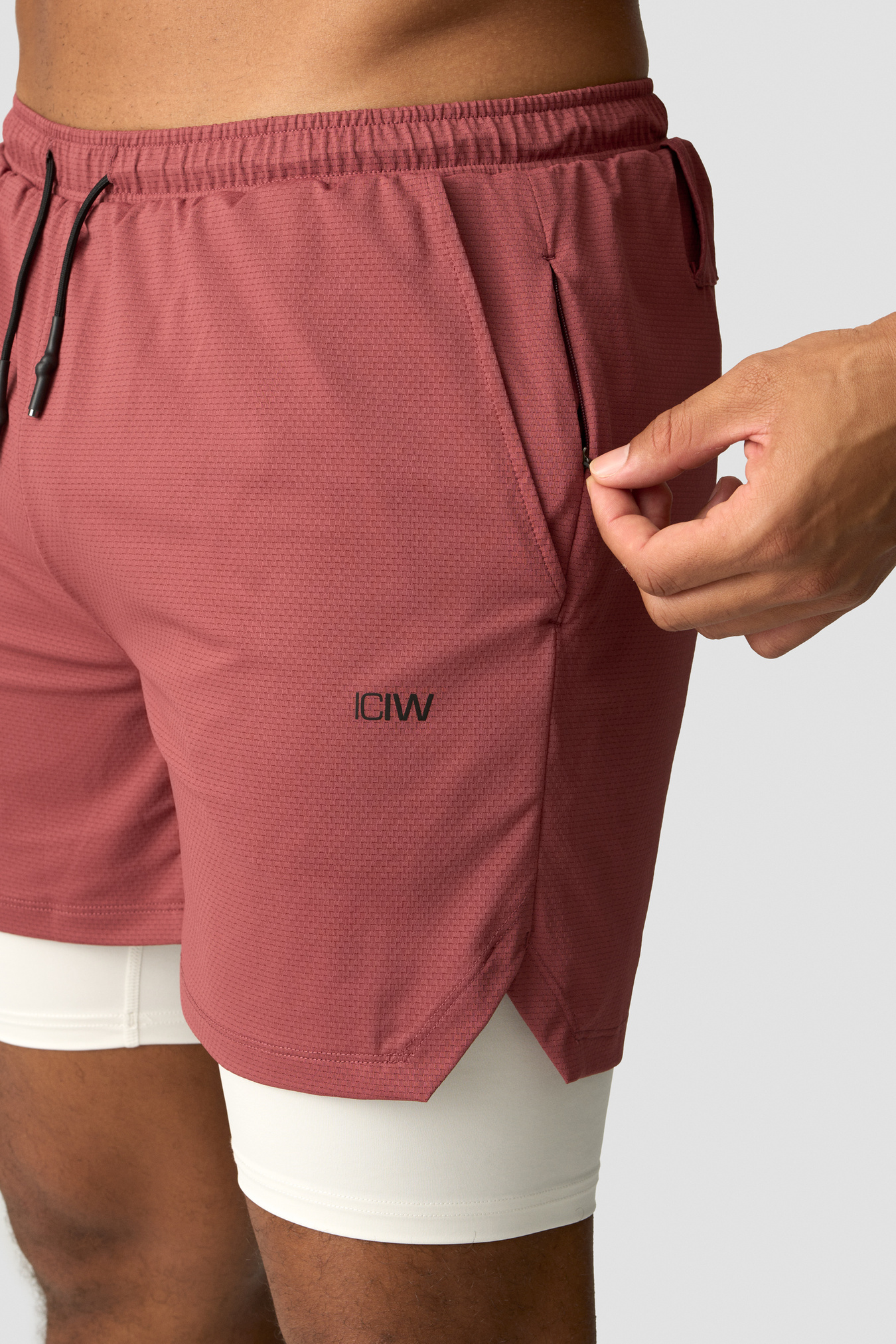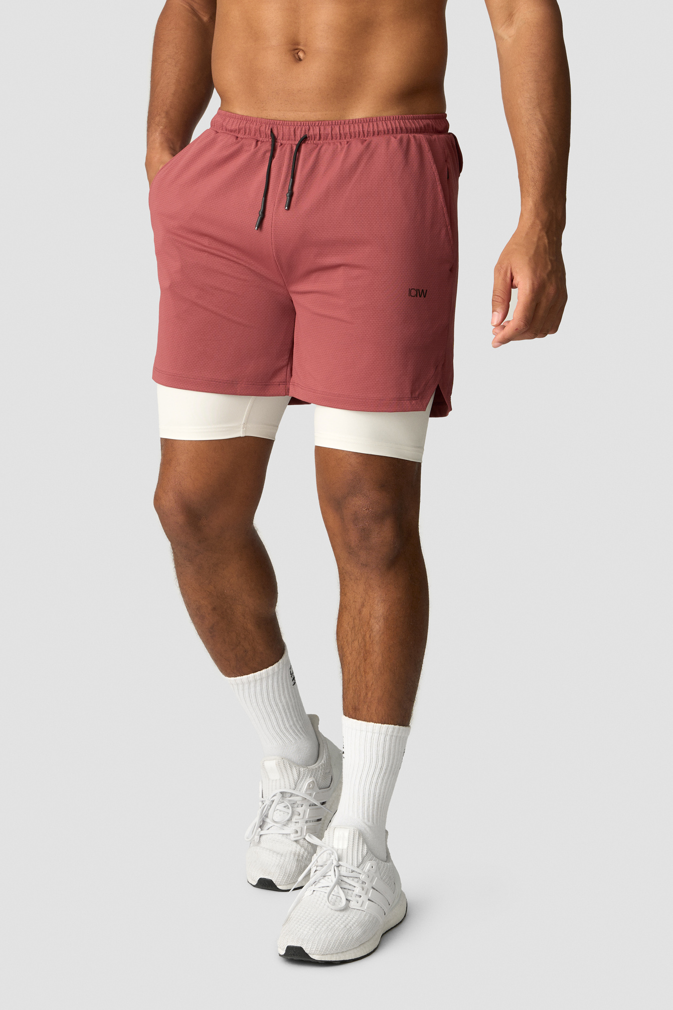 Gym shorts in a 2-in-1 style. Stride 2-in-1 Shorts are made for the gym and heavy workouts. The outer shorts are made out of a lightweight waffle mesh, and the tight inner shorts are made out of a stretchy and flexible material. Together they will help you move easily and without distractions. They have two open hand pockets and a hidden zip pocket, as well as a loop in the back to fasten your towel or shirt. Inner shorts: 75% Polyester, 25% Elastan. Inseam 18.5 cm. Outer shorts: 90% Recycled Polyester, 10% Elastan. Inseam 13 cm. ICIW logo at front. Standard fit. Smokey Brown: 18.5 cm inner shorts. Army: 18.5 cm inner shorts.