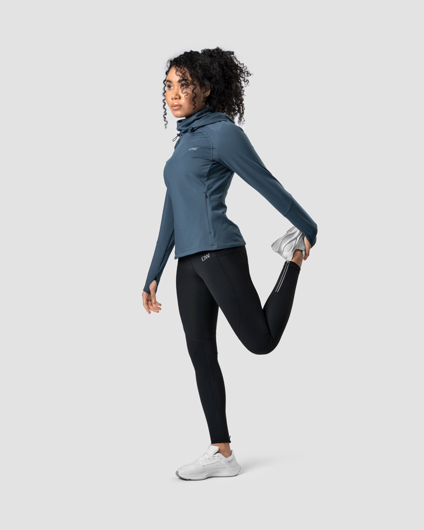 Long sleeve hoodie with extra high collar. Mercury Pullover is a hoodie with a collar that can be pulled up over the chin for extra protection against wind. The hood can be adjusted for a perfect fit. The top has front pockets with invisible zippers and thumb holes at the sleeve. The sideseams are pulled forward for a flattering fit.