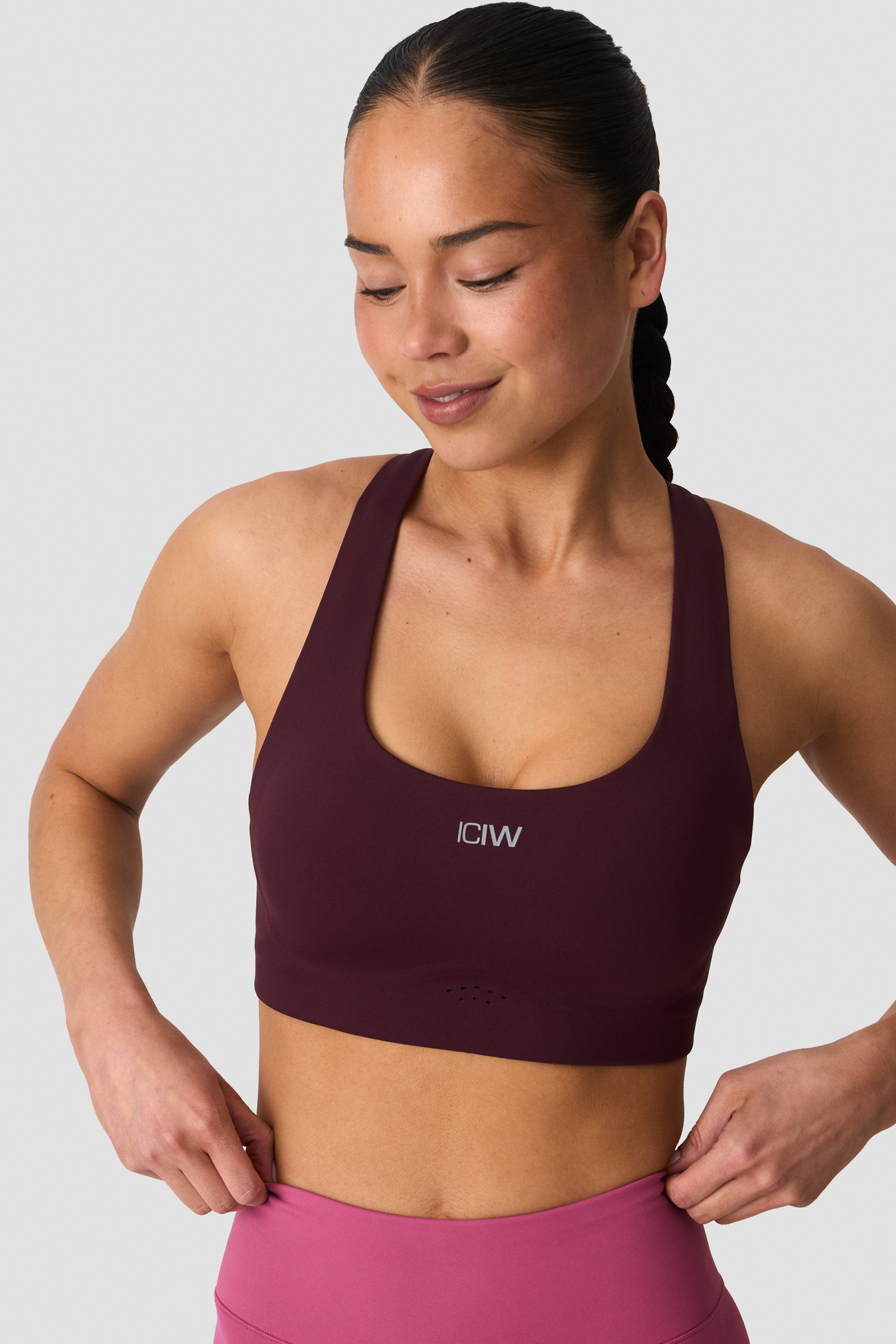 High-support sports bra built for high‑impact cardio. The moisture‑wicking interlock knit keeps you cool and dry while the slim, cut‑and‑sew construction delivers a secure feel. Moulded cups add shape and support, and adjustable straps with double adjusters plus a hook‑and‑eye closure allow a personalised fit. Finished with an ICIW print for a clean look. 75% Polyamide, 25% Elastane.
