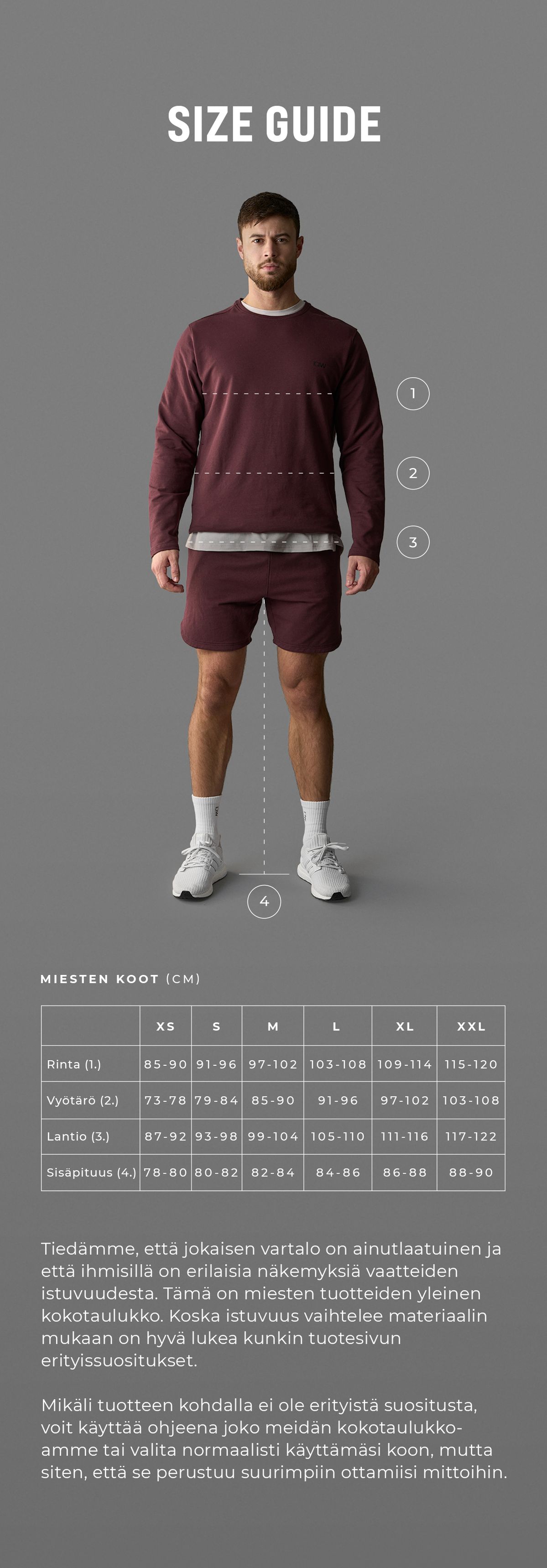 Koko-oppaamme auttaa sinua löytämään vaatteen joka istuu parhaiten juuri sinulle. Tiedämme myös, että kaikki vartalot ovat erilaisia ja että kaikilla on oma mieltymyksensä kuinka vaatteen tulisi istua päällä. Alla olevan koko-oppaan olemme luoneet sen perusteella, kuinka ajattelimme vaatteiden istuvan kun piirsimme ne ja kaikki koot ovat yleisiä. Koska vaatteen istuvuus on erilainen eri materiaalien välillä, niin pyydämme sinua vielä katsomaan tuotteen suositukset tuotesivulta täydentämään koko-opastamme. Mikäli tuotesivulla ei erikseen lue suosituksia, voit mennä oppaamme ja sen mukaan mitä kokoa normaalisti käytät.