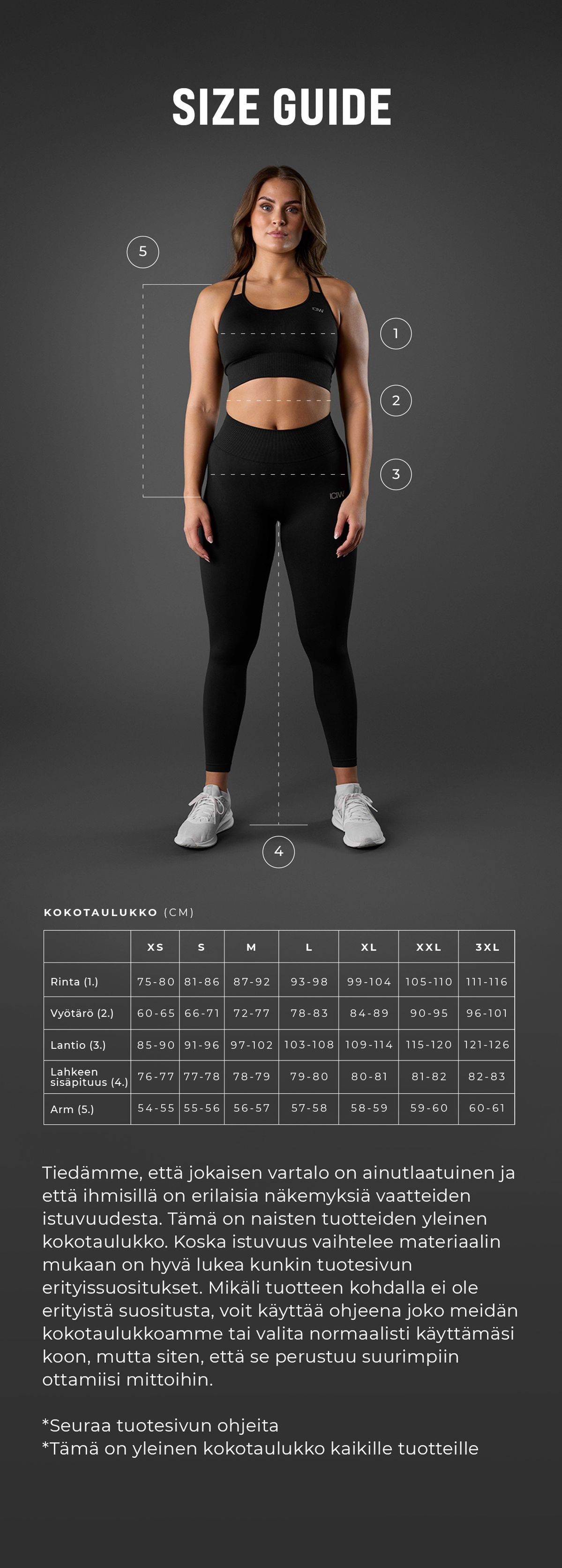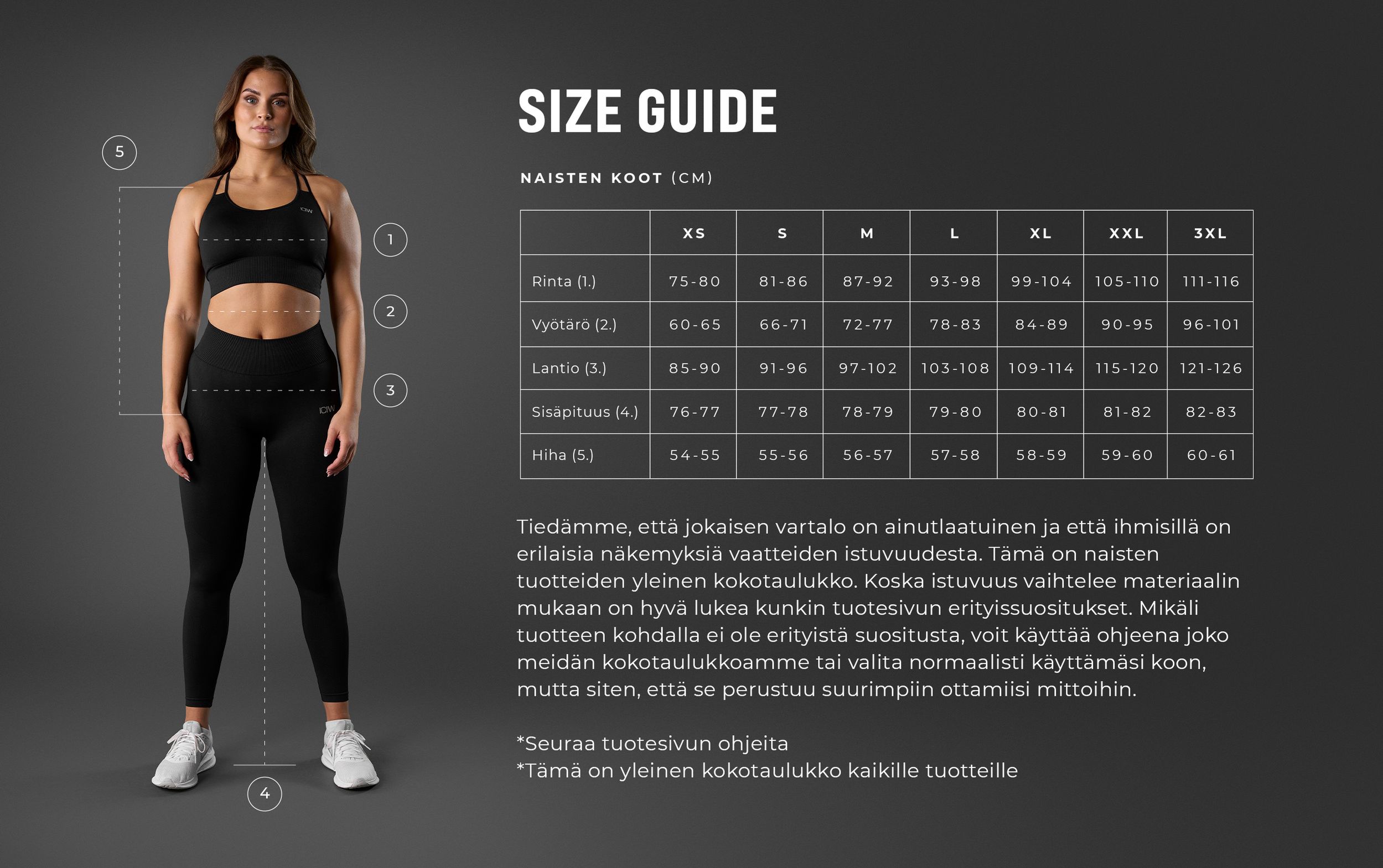 Kokotaulukkomme auttaa sinua löytämään vaatteen joka istuu parhaiten juuri sinulle. Tiedämme, että jokaisen vartalo on ainutlaatuinen ja että ihmisillä on erilaisia näkemyksiä vaatteiden istuvuudesta. Alla olevan kokotaulukon olemme luoneet sen perusteella, kuinka ajattelimme vaatteiden istuvan kun piirsimme ne. Tämä on naisten yleinen kokotaulukko. Koska istuvuus vaihtelee materiaalin mukaan on hyvä lukea kunkin tuotesivun erityissuositukset.